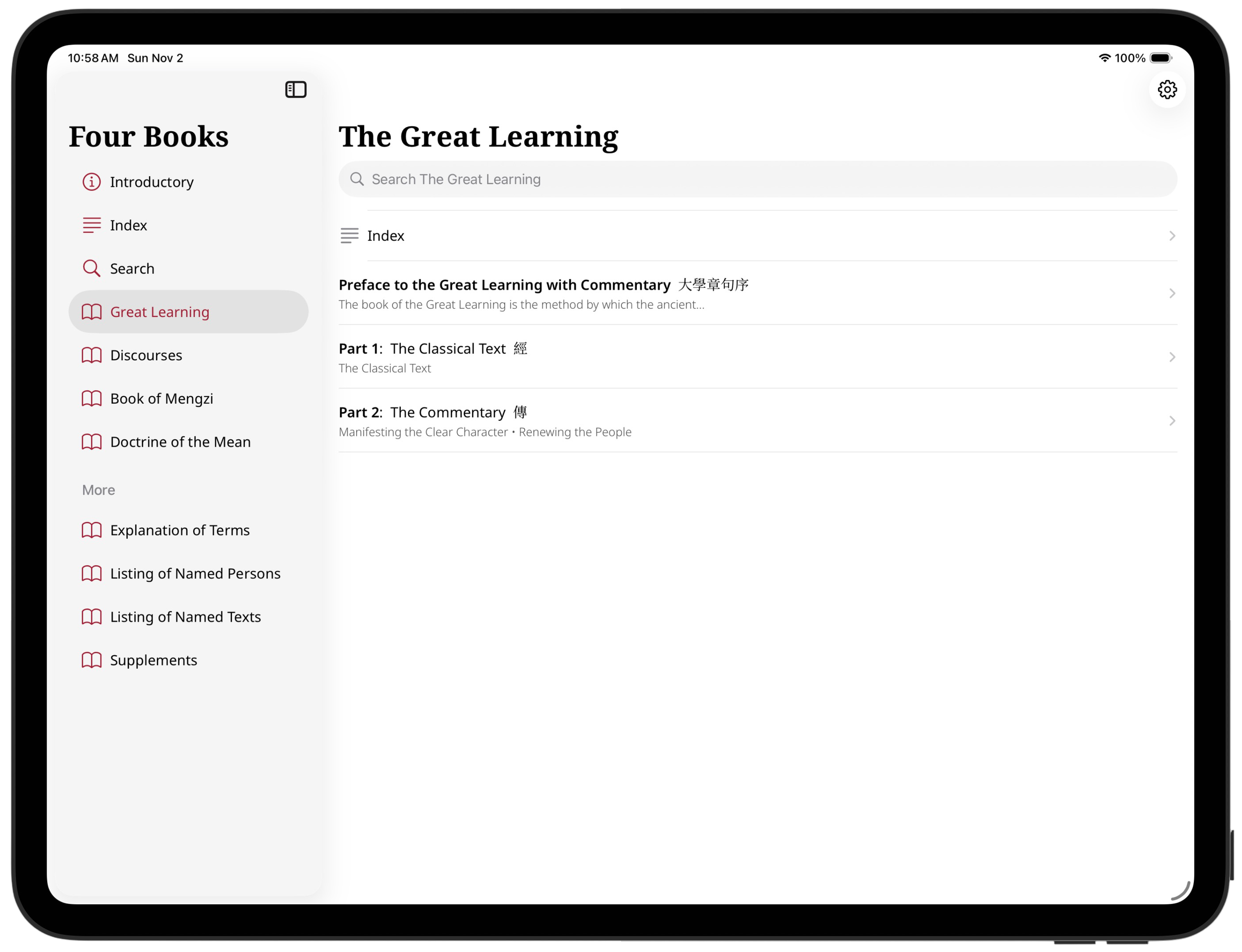 Coming soon to iPhone and iPad—the traditional Confucian curriculum—the Four Books: the Great Learning, the Analects, the Book of Mengzi, and the Doctrine of the Mean. Transmitted through traditional interpretation and an established lexicon, utilizing clean and functional Apple Native UI.
